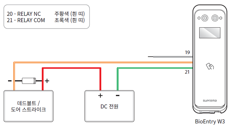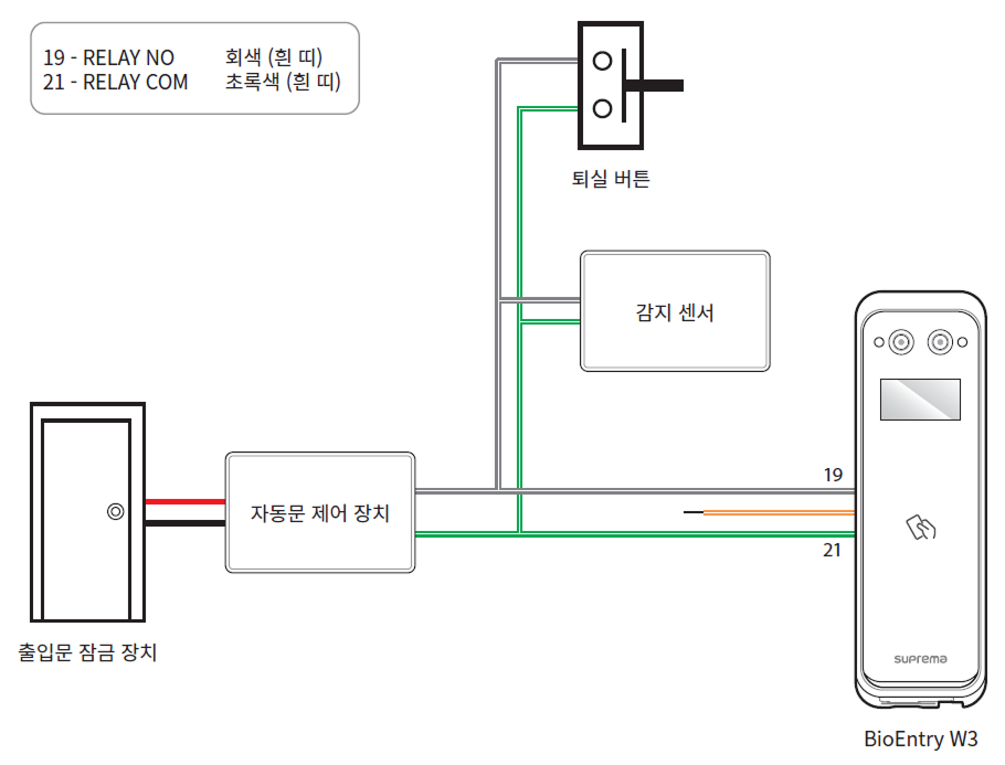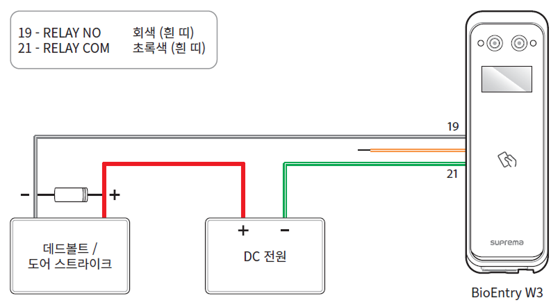 Fail Secure Lock을 사용하려면 아래 그림과 같이 N/O 릴레이를 연결하세요. Fail Secure Lock은 평상 시 릴레이 회로에 전류가 흐르지 않으며, 릴레이가 동작하여 전류가 흐르면 출입문이 열립니다. 정전이 되거나 외부 요인으로 장치의 전원이 끊길 경우 출입문이 잠깁니다.