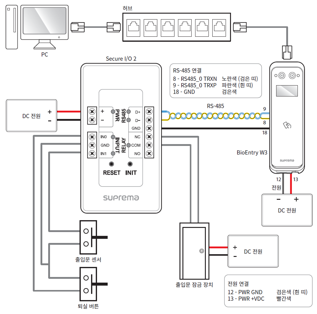 별도의 I/O 장치를 연결하지 않고 제품을 직접 출입문 잠금 장치, 퇴실 버튼, 출입문 센서 등에 연결할 수 있습니다.