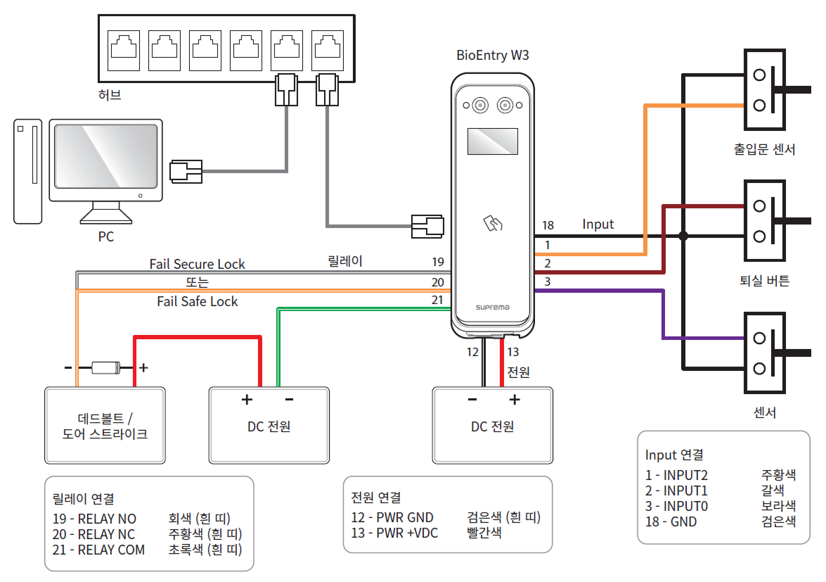 슈프리마의 지능형 장치에는 편의를 제공하기 위해 별도의 컨트롤러 없이 독립형으로 연결하여 출입문을 직접 열거나 잠글 수 있도록 하는 릴레이가 내장되어 있습니다. 그러나 향상된 보안이 요구되는 출입통제 애플리케이션의 경우 잠재적으로 출입문 잠금 해제를 유발할 수 있는 변조 공격을 방지하기 위해 장치에 내장된 릴레이를 사용하지 않는 것이 좋습니다. 이러한 애플리케이션의 경우 잠금 제어를 위해 출입문 내부의 안전한 위치에 설치된 슈프리마의 Secure I/O 2, DM-20, CoreStation과 같은 별도의 릴레이 장치를 사용할 것을 권장합니다.