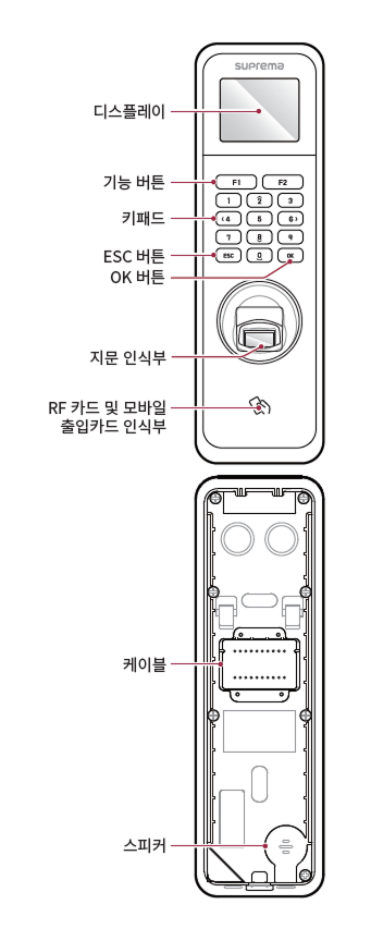 RF 카드 및 모바일 출입카드 인식부: 출입을 위해 RF 카드 또는 모바일 출입카드를 인식시키는 부분입니다.