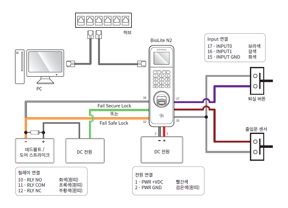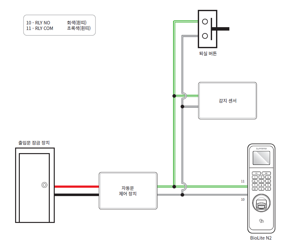 별도의 I/O 장치를 연결하지 않고 제품을 직접 출입문 잠금 장치, 퇴실 버튼, 출입문 센서 등에 연결할 수 있습니다.