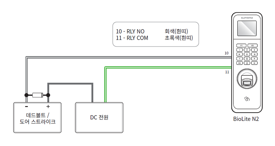 슈프리마의 지능형 장치에는 편의를 제공하기 위해 별도의 컨트롤러 없이 독립형으로 연결하여 출입문을 직접 열거나 잠글 수 있도록 하는 릴레이가 내장되어 있습니다. 그러나 향상된 보안이 요구되는 출입통제 애플리케이션의 경우 잠재적으로 출입문 잠금 해제를 유발할 수 있는 변조 공격을 방지하기 위해 장치에 내장된 릴레이를 사용하지 않는 것이 좋습니다. 이러한 애플리케이션의 경우 잠금 제어를 위해 출입문 내부의 안전한 위치에 설치된 슈프리마의 Secure I/O 2, DM-20, CoreStation과 같은 별도의 릴레이 장치를 사용할 것을 권장합니다.