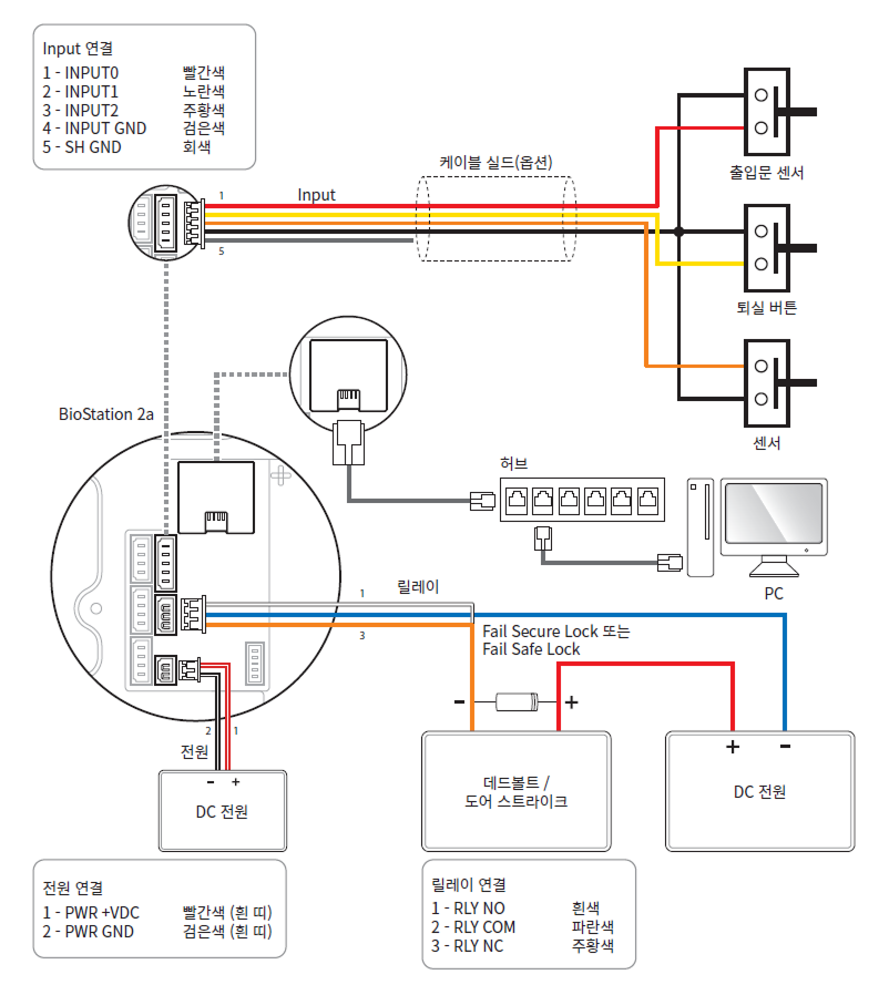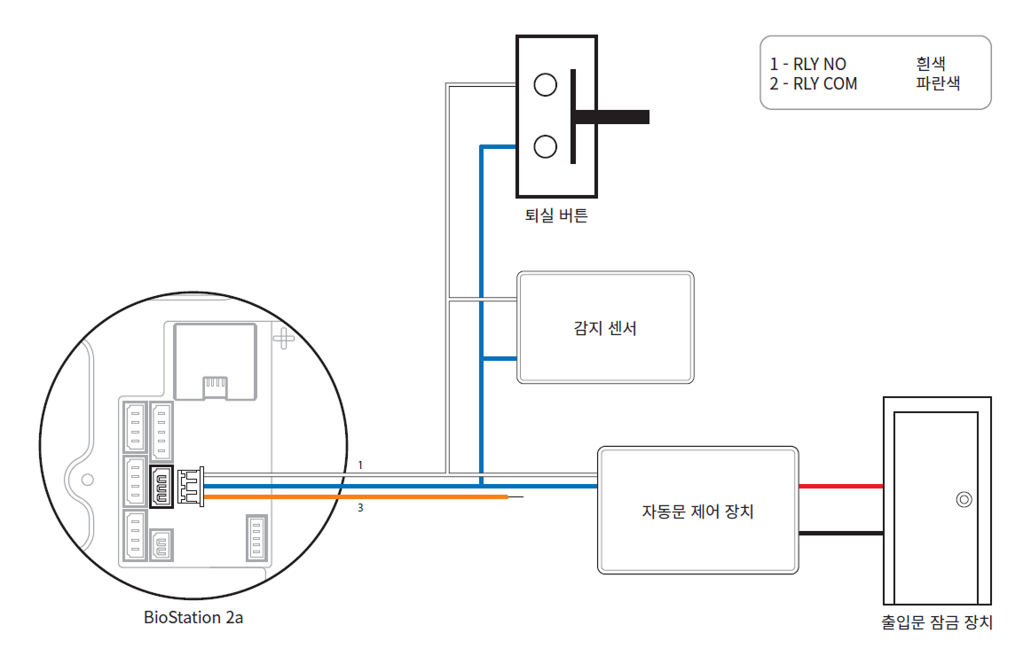 별도의 I/O 장치를 연결하지 않고 제품을 직접 출입문 잠금 장치, 퇴실 버튼, 출입문 센서 등에 연결할 수 있습니다.