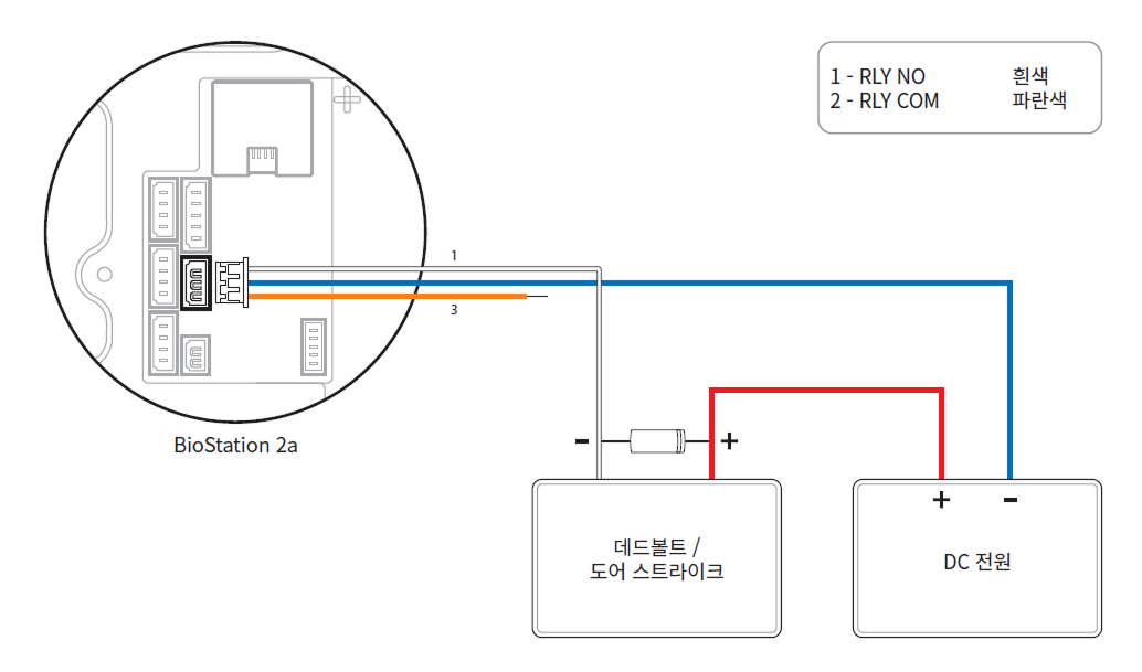 Fail Secure Lock을 사용하려면 아래 그림과 같이 N/O 릴레이를 연결하세요. Fail Secure Lock은 평상 시 릴레이 회로에 전류가 흐르지 않으며, 릴레이가 동작하여 전류가 흐르면 출입문이 열립니다. 정전이 되거나 외부 요인으로 장치의 전원이 끊길 경우 출입문이 잠깁니다.