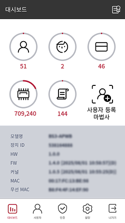 사용자를 등록하거나 장치를 설정하려면 대시보드 하단에서 원하는 메뉴를 선택하세요.