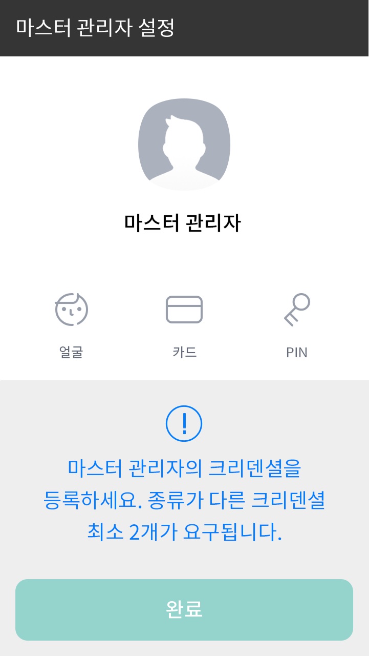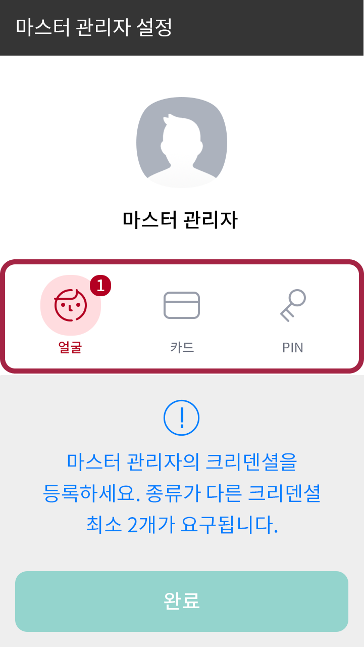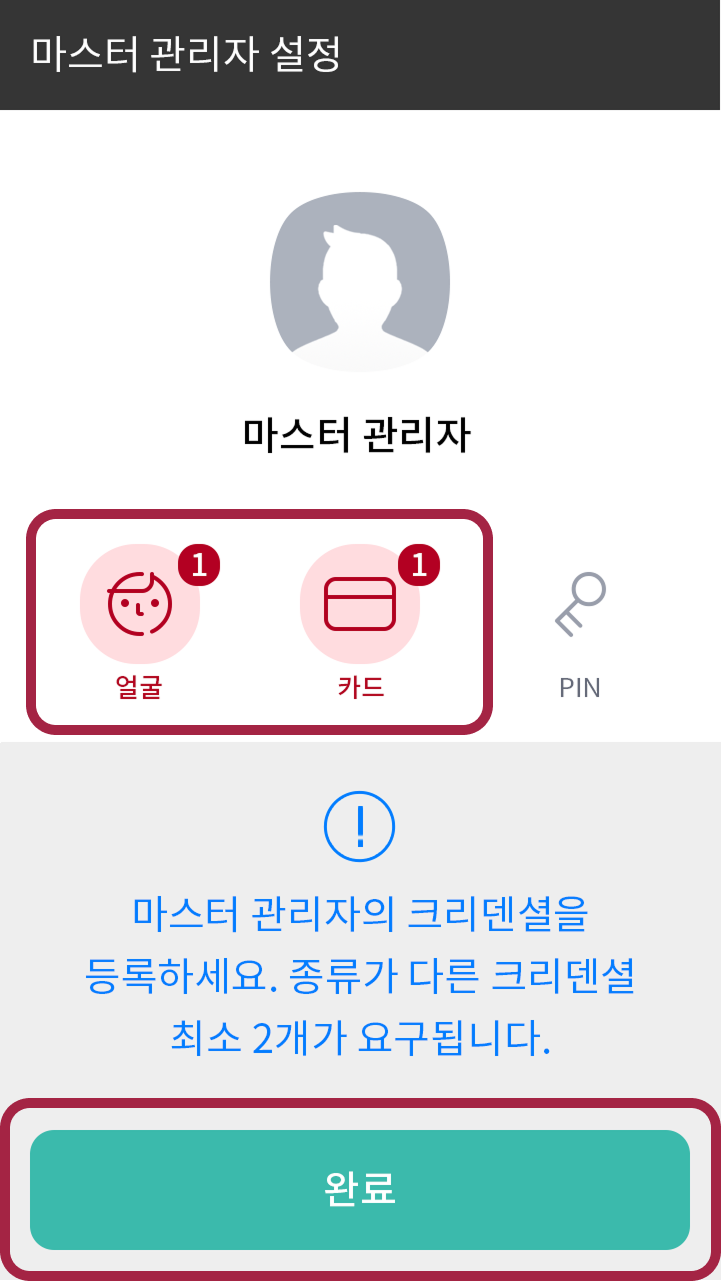 두 종류 이상의 크리덴셜을 등록한 후, 완료 버튼을 누르면 마스터 관리자 등록이 완료됩니다.
