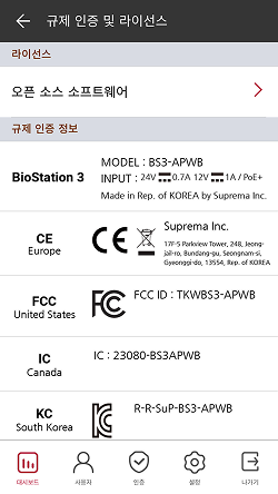 를 터치하면 규제 인증 및 라이선스를 확인할 수 있습니다.