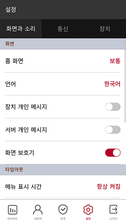 화면 보호기: 화면 보호기 사용 여부를 설정할 수 있습니다. 화면 보호기를 사용하면 장치를 사용하지 않을 때 화면 밝기를 줄여 불필요한 전력 소모를 줄일 수 있습니다.