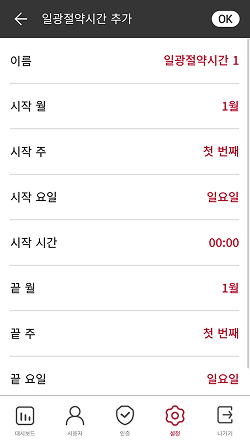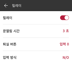 릴레이: 릴레이 활성화 여부를 설정할 수 있습니다. 릴레이 설정을 켜면 문열림 시간, 퇴실 버튼을 설정할 수 있습니다.