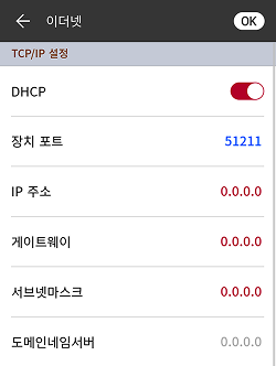 DHCP: DHCP 사용 여부를 설정하세요. DHCP 설정을 끄면 IP 주소, 게이트웨이, 서브넷마스크를 사용자가 수정할 수 있습니다.
