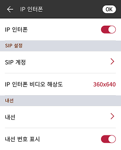 IP 인터폰: IP 인터폰 활성화 여부를 설정할 수 있습니다. IP 인터폰 설정을 켜면 SIP 계정과 내선을 설정할 수 있습니다.