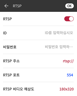 RTSP: RTSP 활성화 여부를 설정할 수 있습니다. RTSP 설정을 켜면 ID, 비밀번호, RTSP 주소, RTSP 포트, RTSP 비디오 해상도를 설정할 수 있습니다.