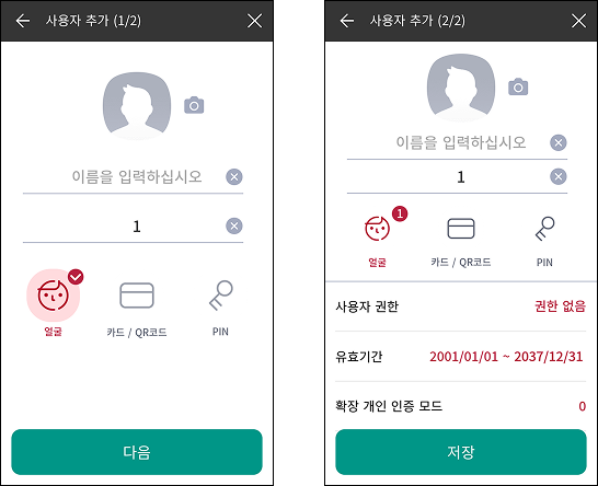 카드 / QR코드: 사용자 인증을 위한 카드를 등록할 수 있습니다. 카드 / QR코드 → 다음을 누른 뒤 사용자에게 할당할 카드를 RF 카드 인증부에 스캔하세요. 카드를 더 등록하려면 카드 / QR코드 →