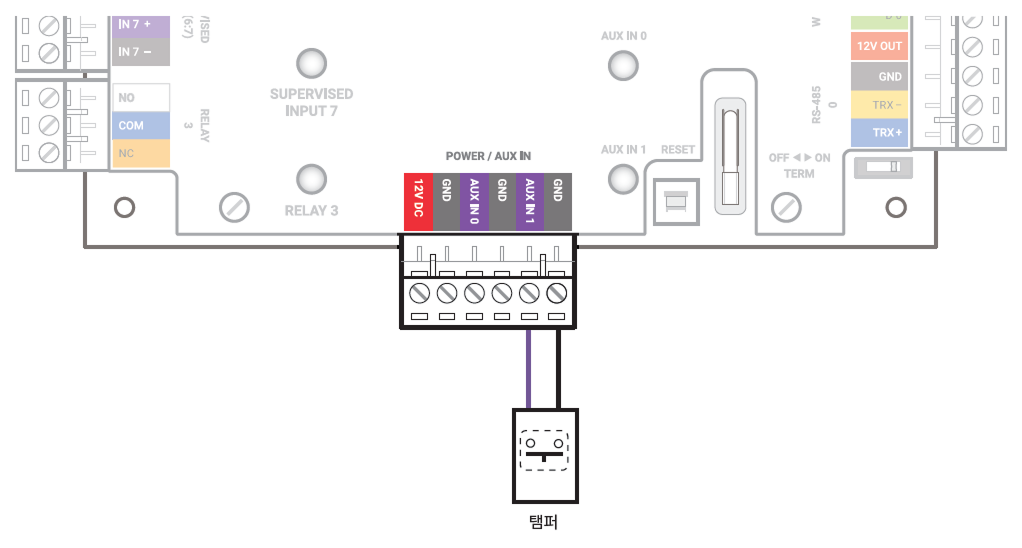 전원 장애 감지기나 탬퍼를 AUX IN 단자에 연결할 수 있습니다.