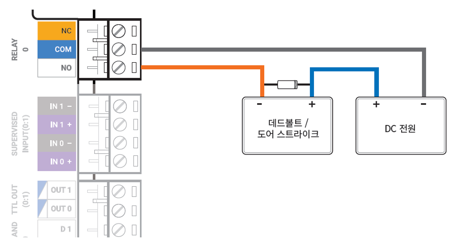 Fail Secure Lock을 사용하려면 아래 그림과 같이 NO 릴레이를 연결하세요. Fail Secure Lock은 평상 시 릴레이 회로에 전류가 흐르지 않으며, 릴레이가 동작하여 전류가 흐르면 출입문이 열립니다. 정전이 되거나 외부 요인으로 장치의 전원이 끊길 경우 출입문이 잠깁니다.