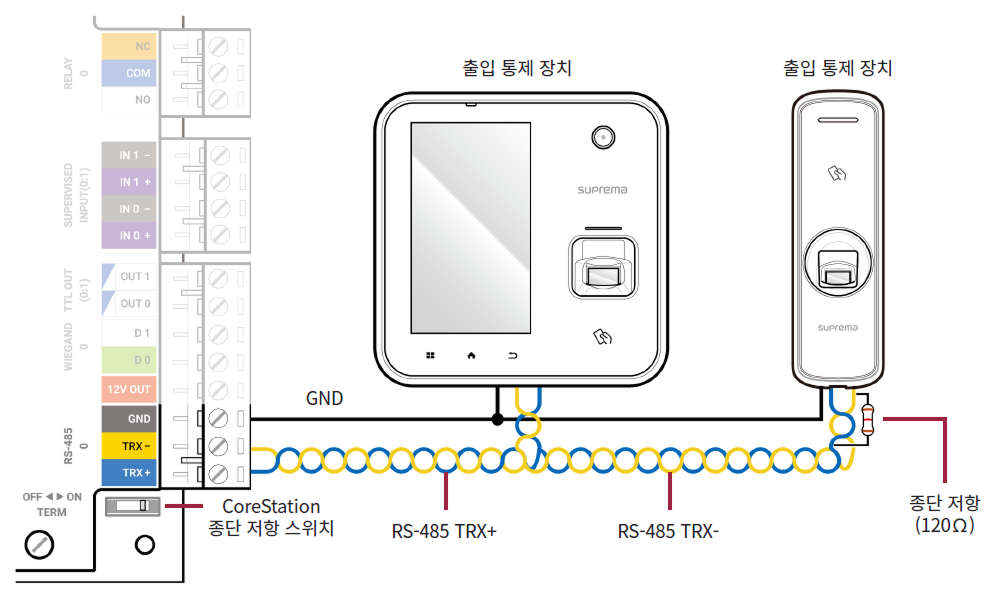 RS-485 데이지 체인 연결의 양 끝에 종단 저항(120 Ω)을 연결하세요. 중간 선로에 연결할 경우 신호 레벨이 작아져 통신 성능이 떨어지므로 반드시 데이지 체인 연결의 양 끝에 연결하세요. 이 제품의 종단 저항 스위치를 ON으로 설정하세요.
