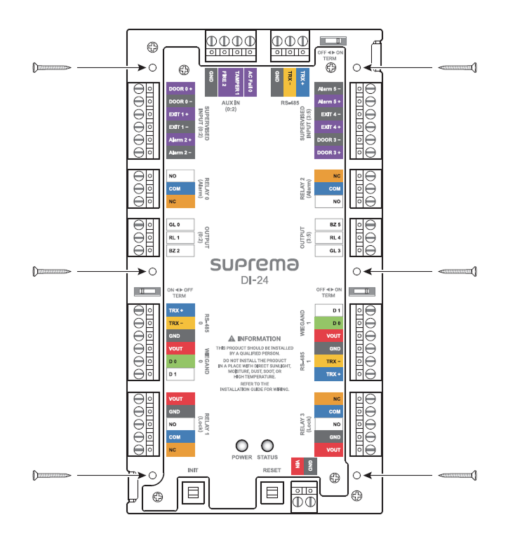 이 제품은 3개의 RS-485 포트를 지원하며, 마스터 장치에 여러대의 Door Interface를 데이지 체인으로 연결하면 최대 34개의 출입문을 구성할 수 있습니다.