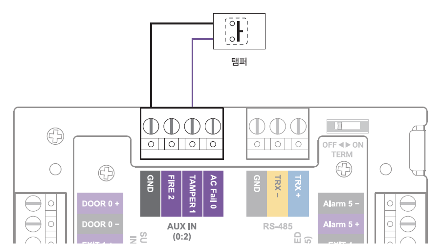전원 장애 감지기, 탬퍼 또는 화재 감지기를 AUX IN 단자에 연결할 수 있습니다.