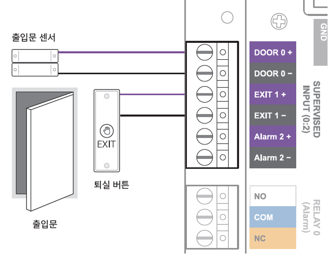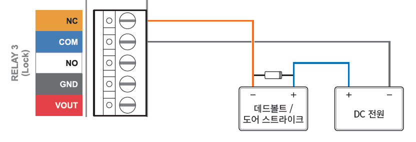 Lock: 스트라이크 락, 마그네틱 락 등 출입문 잠금 및 해제를 위한 장치와 연결할 수 있습니다.