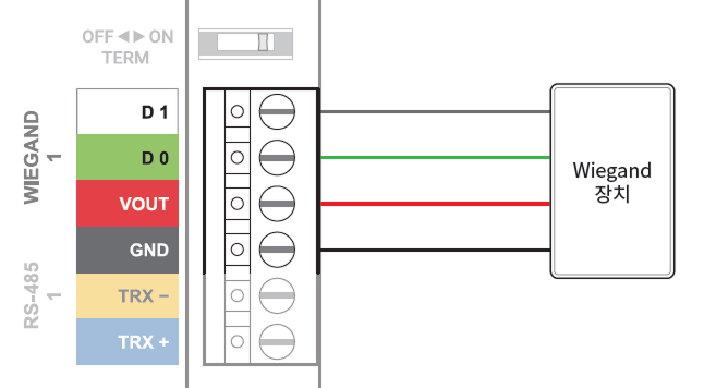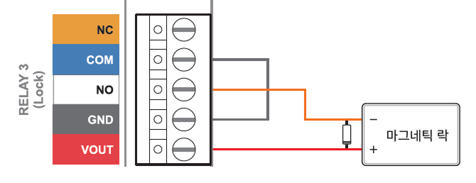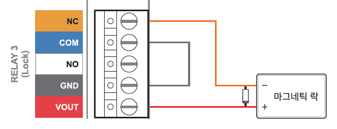 마그네틱 락을 사용하는 경우 아래 그림과 같이 락 전원을 Lock 단자의 GND, VOUT에 직접 연결하세요.