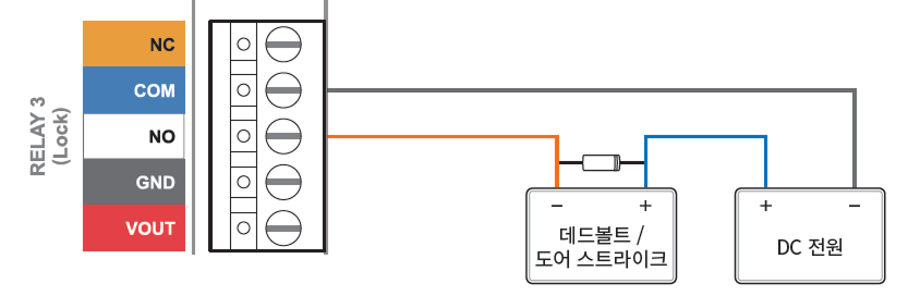 락 전원을 직접 연결하는 경우 마그네틱 락만 사용할 수 있습니다.