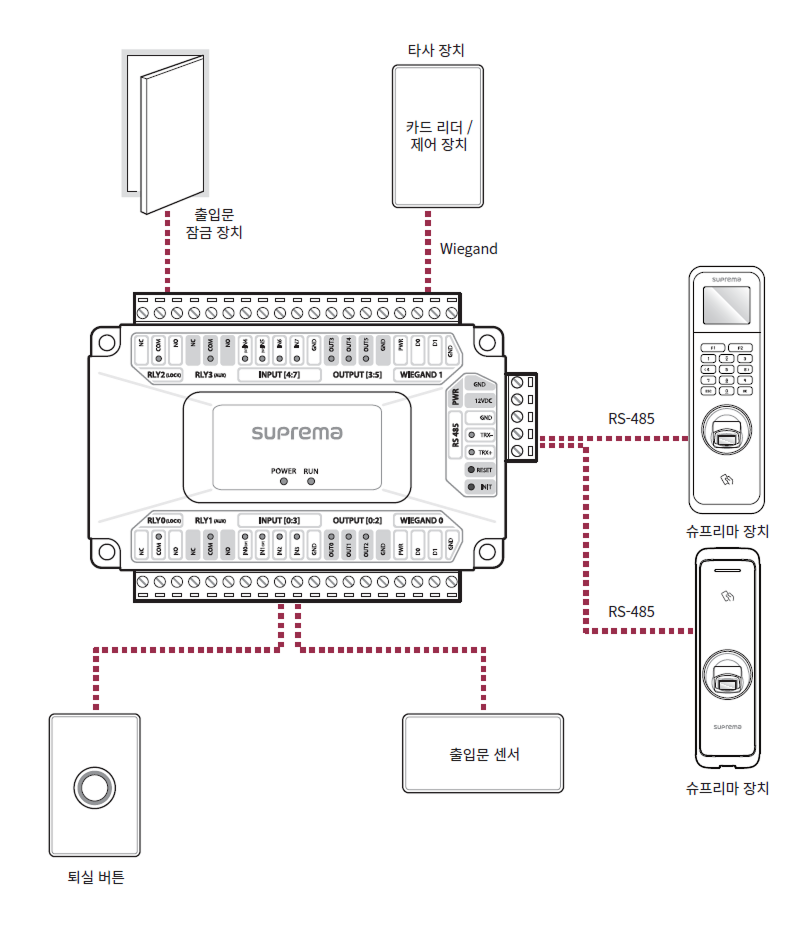 이 제품은 다양한 입출력과 Wiegand 연결을 지원하며, 슈프리마 장치와 타사 장치를 연동하여 확장성을 높일 수 있습니다.