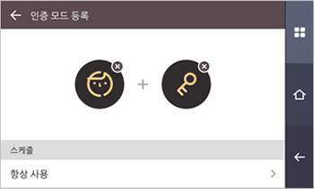 장치의 인증 모드를 설정할 수 있습니다. 얼굴, PIN, 카드, ID를 조합하여 인증 모드로 사용할 수 있으며, 각 인증 모드마다 사용할 스케줄을 설정할 수도 있습니다.
