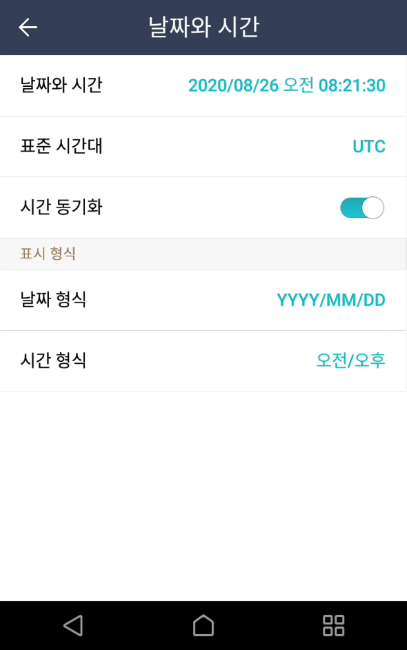 날짜와 시간: 현재 날짜와 시간을 확인할 수 있습니다. 직접 수정하려면 시간 동기화를 끄세요.