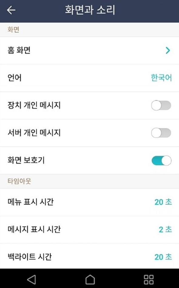 메시지 표시 시간: 설정 완료 메시지나 알림 메시지 등이 자동으로 사라지는 시간(초)을 설정할 수 있습니다.