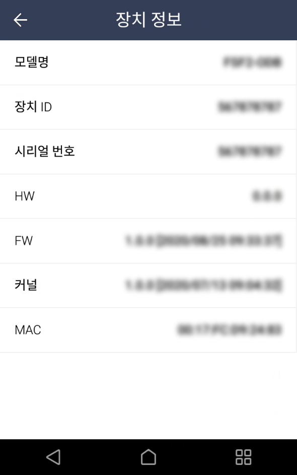 장치 → 장치 정보를 선택하세요. 모델명, 장치 ID, 시리얼 번호, HW, FW, 커널, MAC 정보를 확인할 수 있습니다.