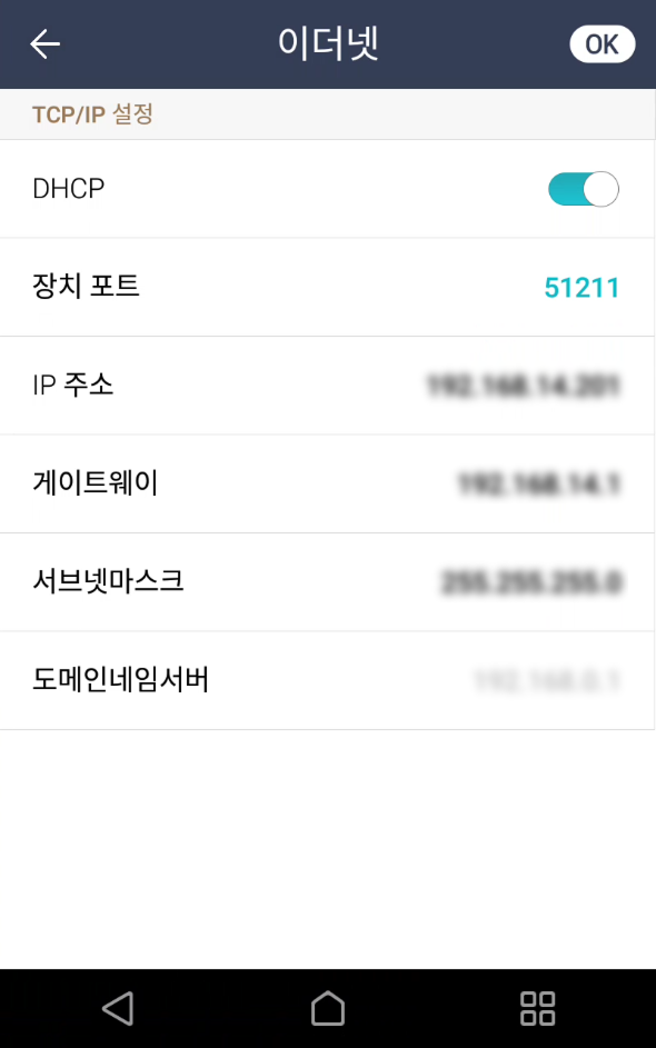 DHCP: DHCP 사용 여부를 설정하세요. DHCP 설정을 끄면 장치 포트, IP 주소, 게이트웨이, 서브넷마스크를 사용자가 수정할 수 있습니다.