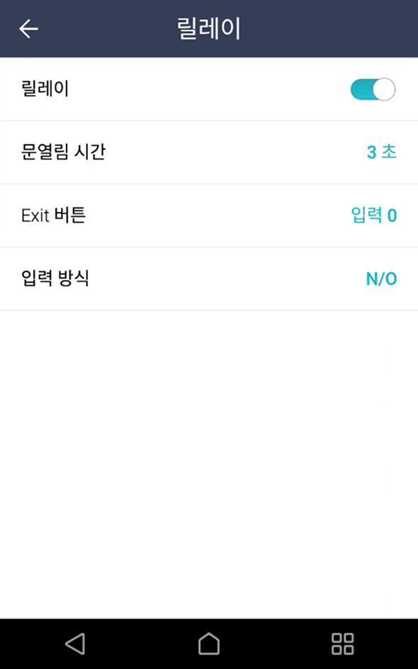 릴레이: 릴레이 활성화 여부를 설정할 수 있습니다. 릴레이 설정을 켜면 문열림 시간, Exit 버튼을 설정할 수 있습니다.