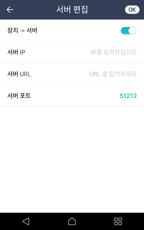 장치 → 서버: 장치에서 입력한 정보를 가진 서버로 직접 연결 신호를 보낼 수 있습니다. 장치 → 서버 설정을 켜면 서버 IP, 서버 URL, 서버 포트를 사용자가 입력할 수 있습니다.