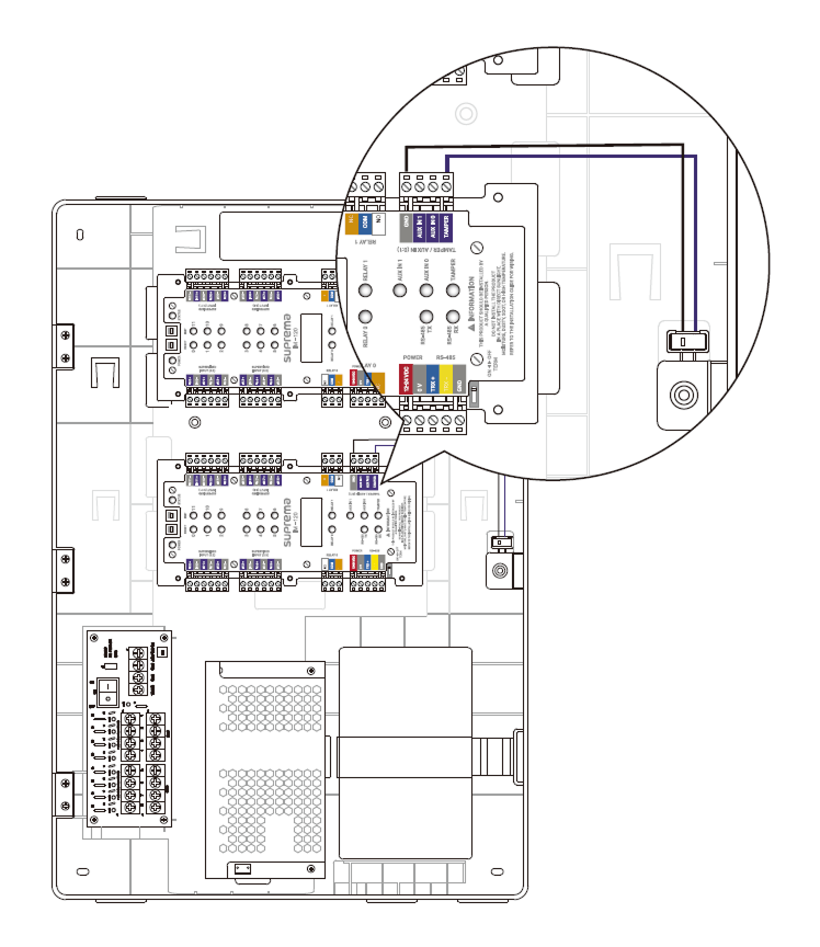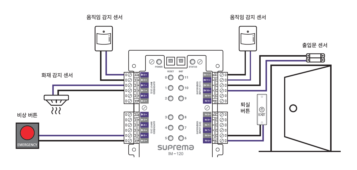 화재 감지 센서, 열 감지 센서, 방범 센서, 출입문 센서, 퇴실 버튼 등을 연결할 수 있습니다. SUPERVISED INPUT 0~11 단자는 회로에 흐르는 전압을 감지하여 장치의 단선, 단락, 켜짐, 꺼짐 상태를 모니터링할 수 있으며, 일반적인 Input으로 사용할 수도 있습니다.