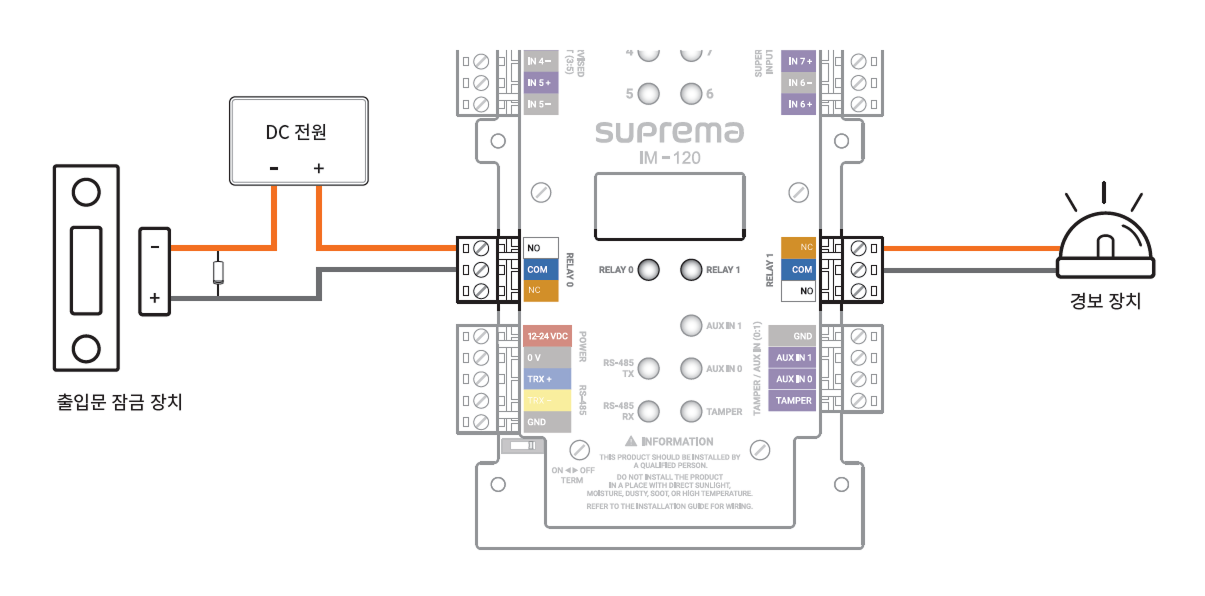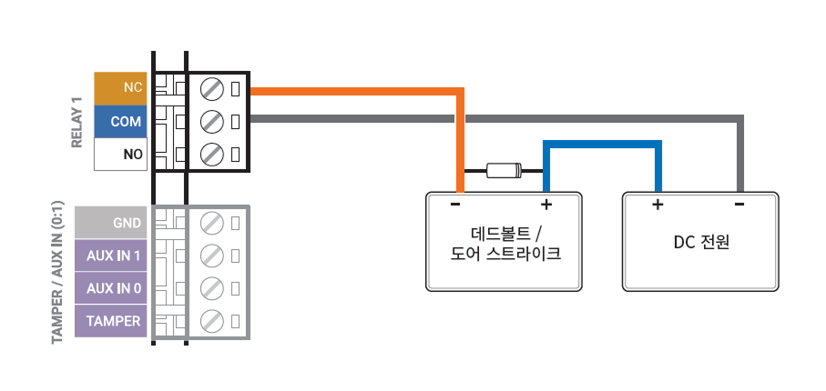 이 제품의 릴레이로 출입문 잠금 장치 또는 경보 장치를 제어할 수 있습니다. 연결할 장치의 가이드를 참고하여 릴레이를 NC 또는 NO로 연결하세요.