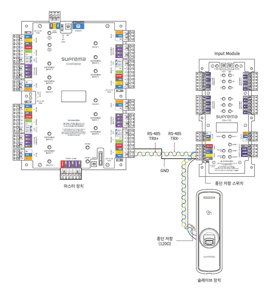 RS-485 데이지 체인 연결의 양 끝에 종단 저항(120 Ω)을 연결하세요. 중간 선로에 연결할 경우 신호 레벨이 작아져 통신 성능이 떨어지므로 반드시 데이지 체인 연결의 양 끝에 연결하세요. 이 제품의 종단 저항 스위치를 ON으로 설정하세요.