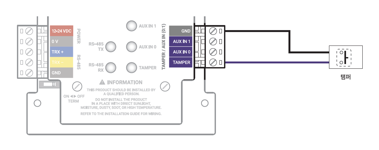 이 제품은 1㏀, 2.2㏀, 4.7㏀, 10㏀ 저항을 연결하여 사용할 수 있습니다. 연결할 입력 장치에 알맞는 저항을 연결한 뒤 BioStar X에서 저항 값을 동일하게 설정하세요.