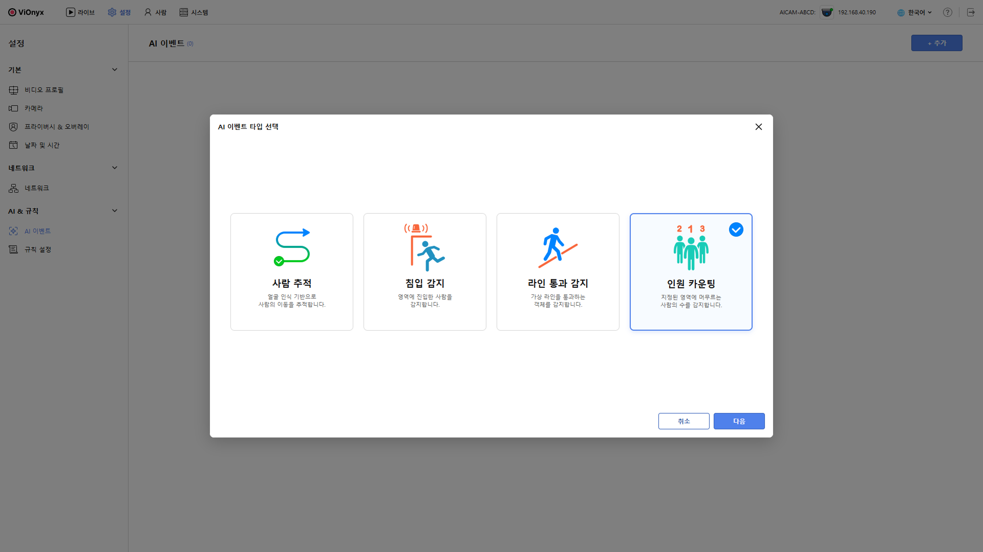 AI 이벤트 타입 선택 창에서 인원 카운팅을 선택하고 다음 버튼을 클릭하세요.
