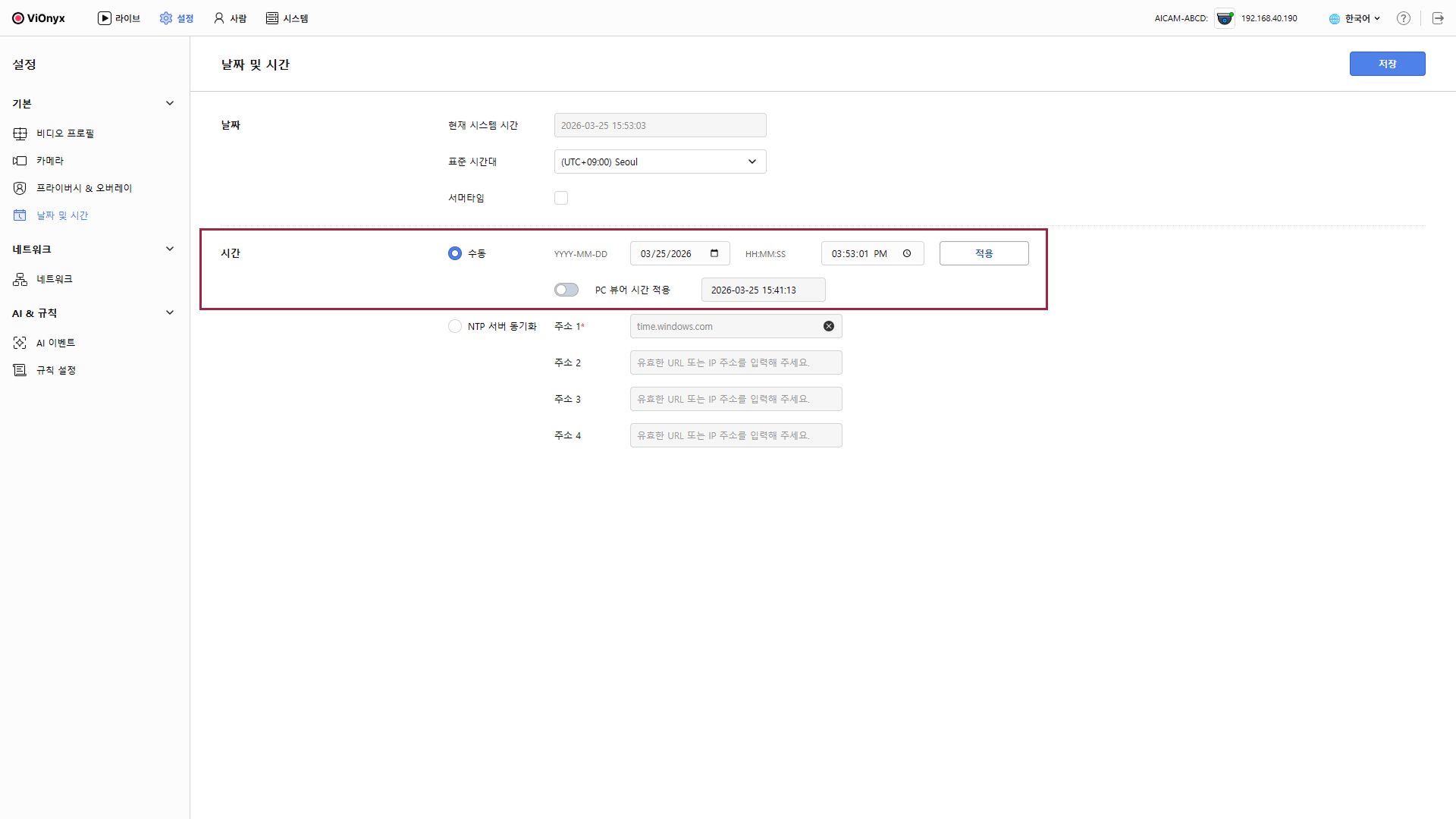 PC의 시간을 카메라에 자동으로 적용하려면, PC 뷰어 시간 적용 옵션을 활성화하세요. 브라우저의 시스템 시간이 카메라에 적용됩니다.