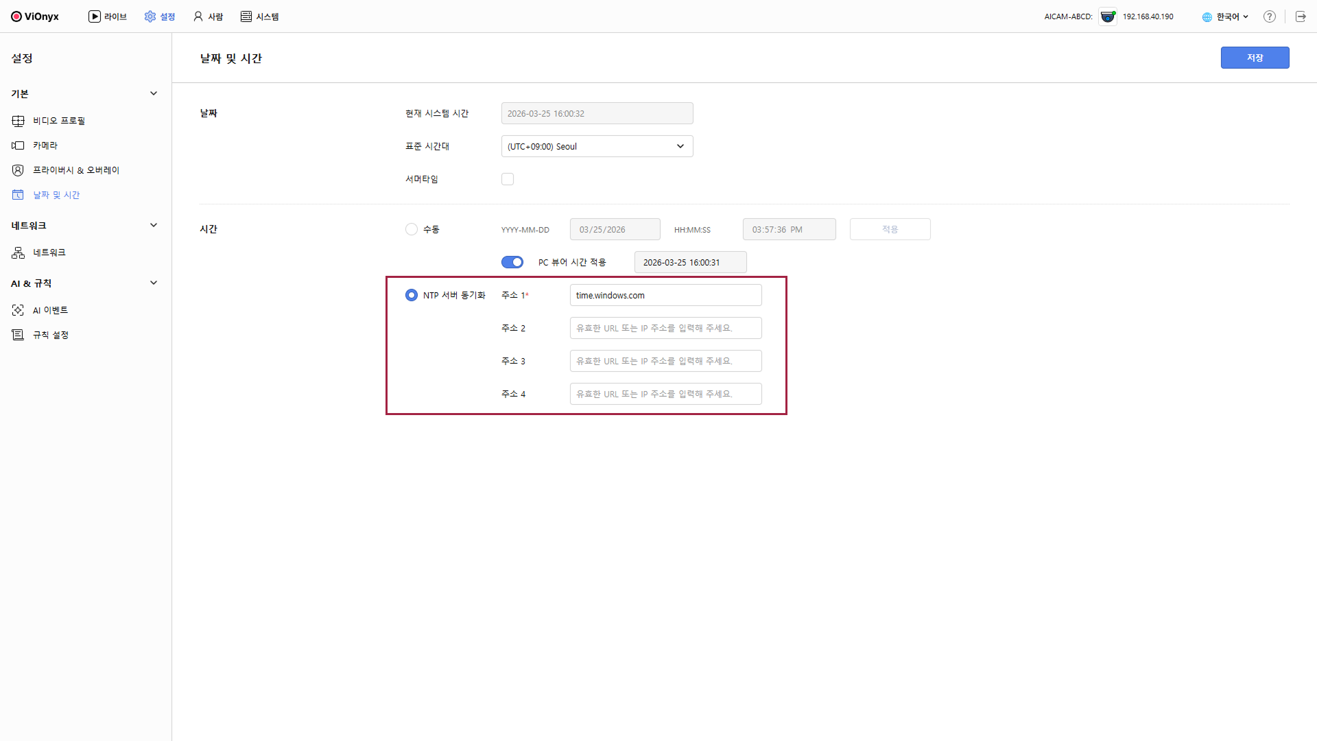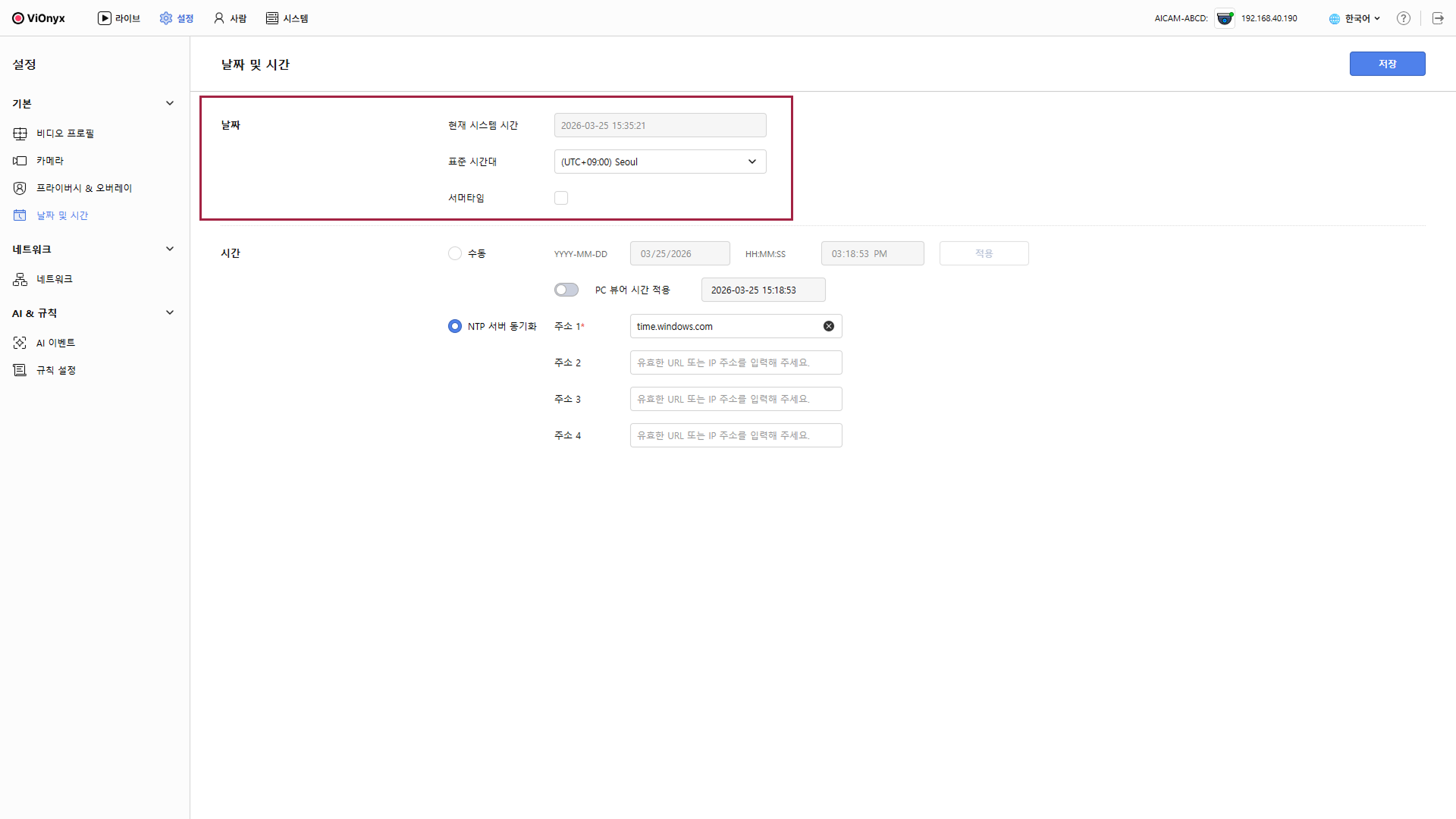 날짜와 시간 설정을 통해 카메라의 시간을 정확하게 유지할 수 있습니다. 시간대를 선택하고 수동으로 시간을 설정하거나 NTP 서버를 통해 자동으로 시간을 동기화할 수 있습니다. 정확한 시간은 영상 타임스탬프 및 AI 이벤트 기록의 신뢰성을 보장합니다.