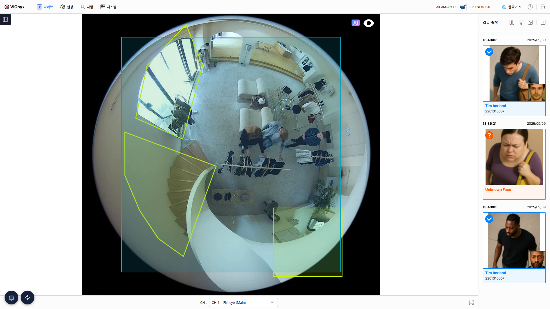 등록된 사용자는 라이브 메뉴에서 신원을 자동 인식해 이름이 표시됩니다. 등록되지 않은 사용자는 미인식 얼굴으로 표시됩니다.