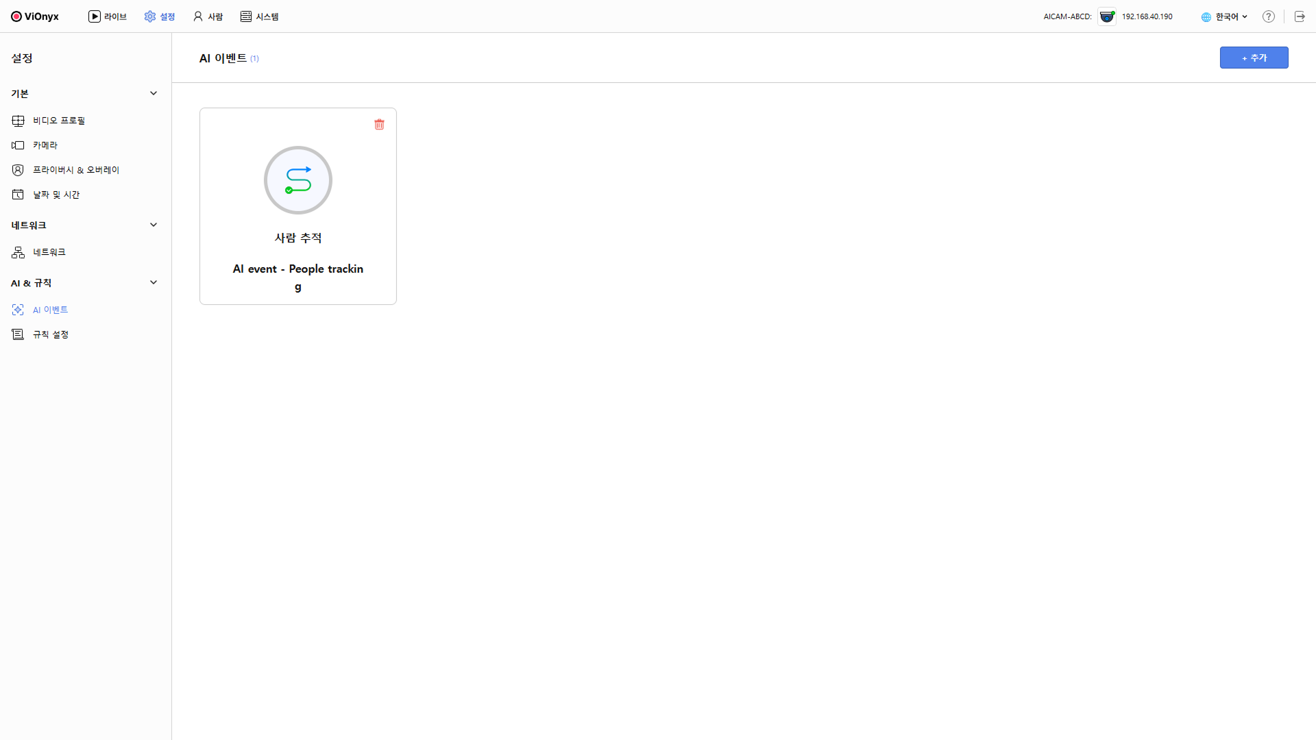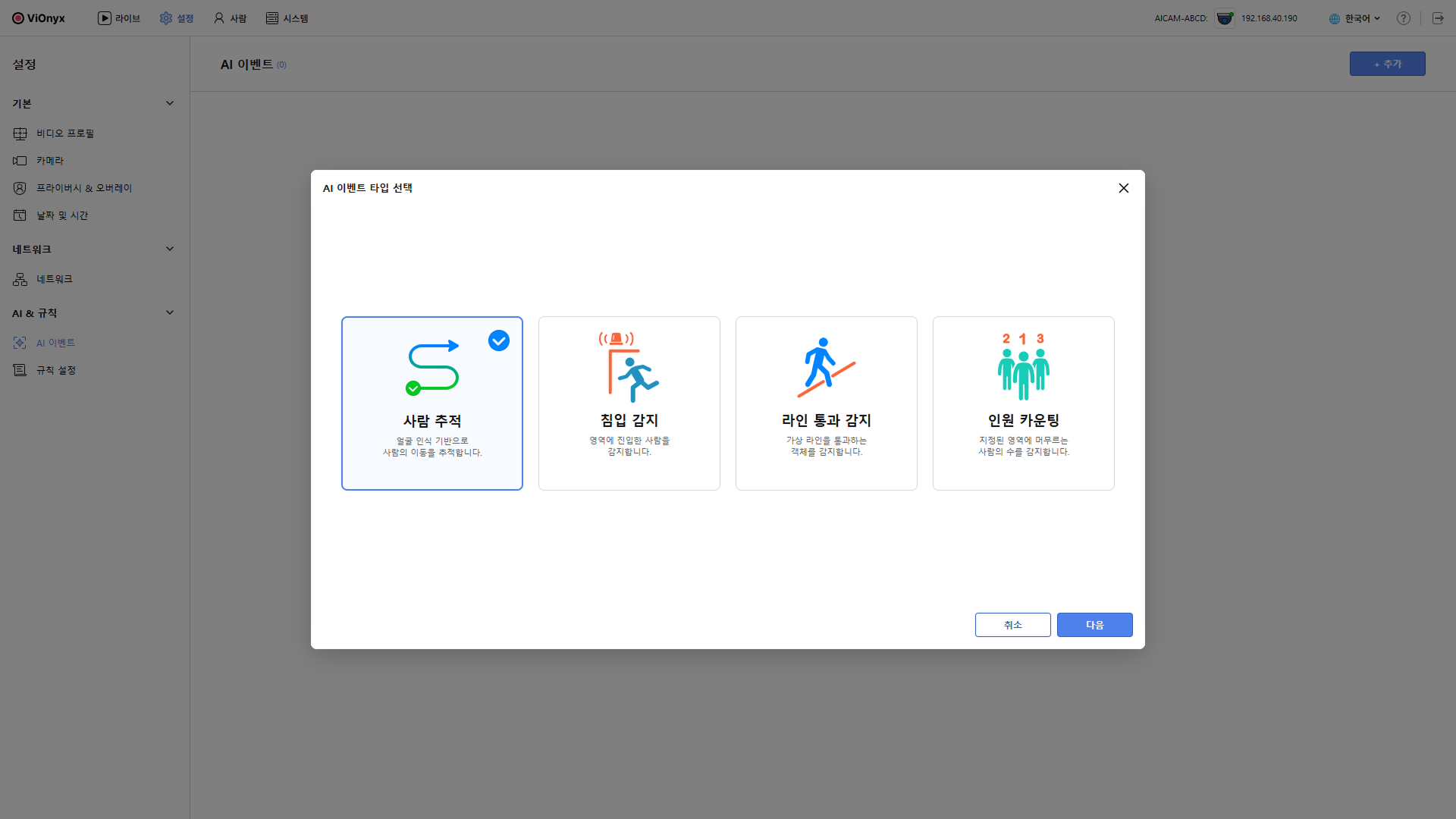 AI 이벤트 타입 선택 창에서 사람 추적을 선택하고 다음 버튼을 클릭하세요.