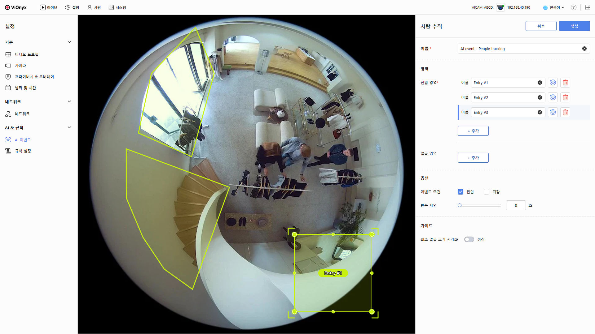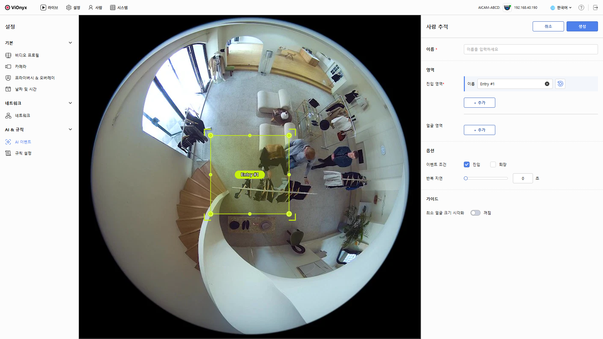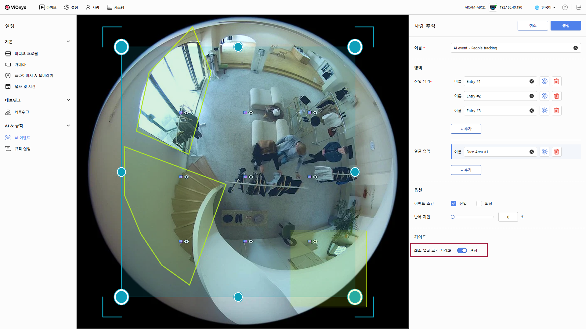 사람 추적 이벤트를 생성하여 진입 구역의 출입을 감지합니다. 선택적으로 얼굴 영역을 추가하면 특정 영역에서 얼굴을 우선적으로 추적할 수 있으며, 등록된 사용자는 신원을 자동 인식합니다.