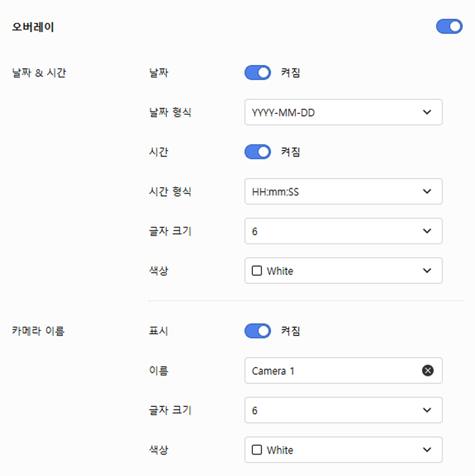 라이브 뷰에 날짜/시간과 카메라 이름을 표시할 수 있습니다. 오버레이 옵션을 활성화하고, 날짜 & 시간, 카메라 이름에서 세부 설정을 조정하세요.