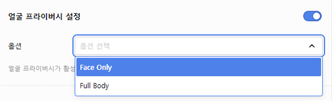 카메라가 감지한 얼굴 또는 전신을 자동으로 블러 처리하여 개인정보를 보호할 수 있습니다. 얼굴 프라이버시 설정 옵션을 활성화하고 원하는 블러 처리 범위를 선택하세요.
