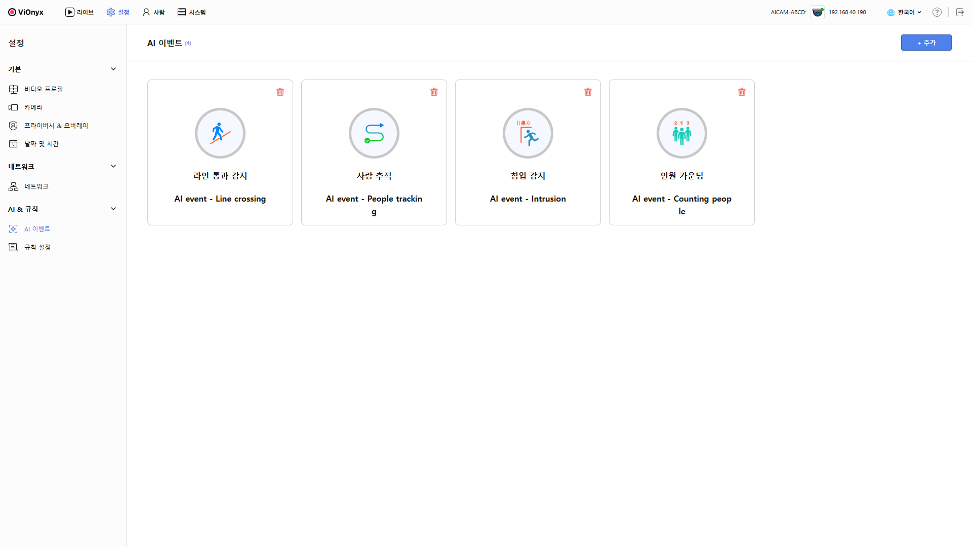 삭제한 AI 이벤트는 복구할 수 없습니다. 삭제하기 전에 AI 이벤트가 연동된 규칙(Rule)이 있다면 규칙도 함께 삭제됩니다.