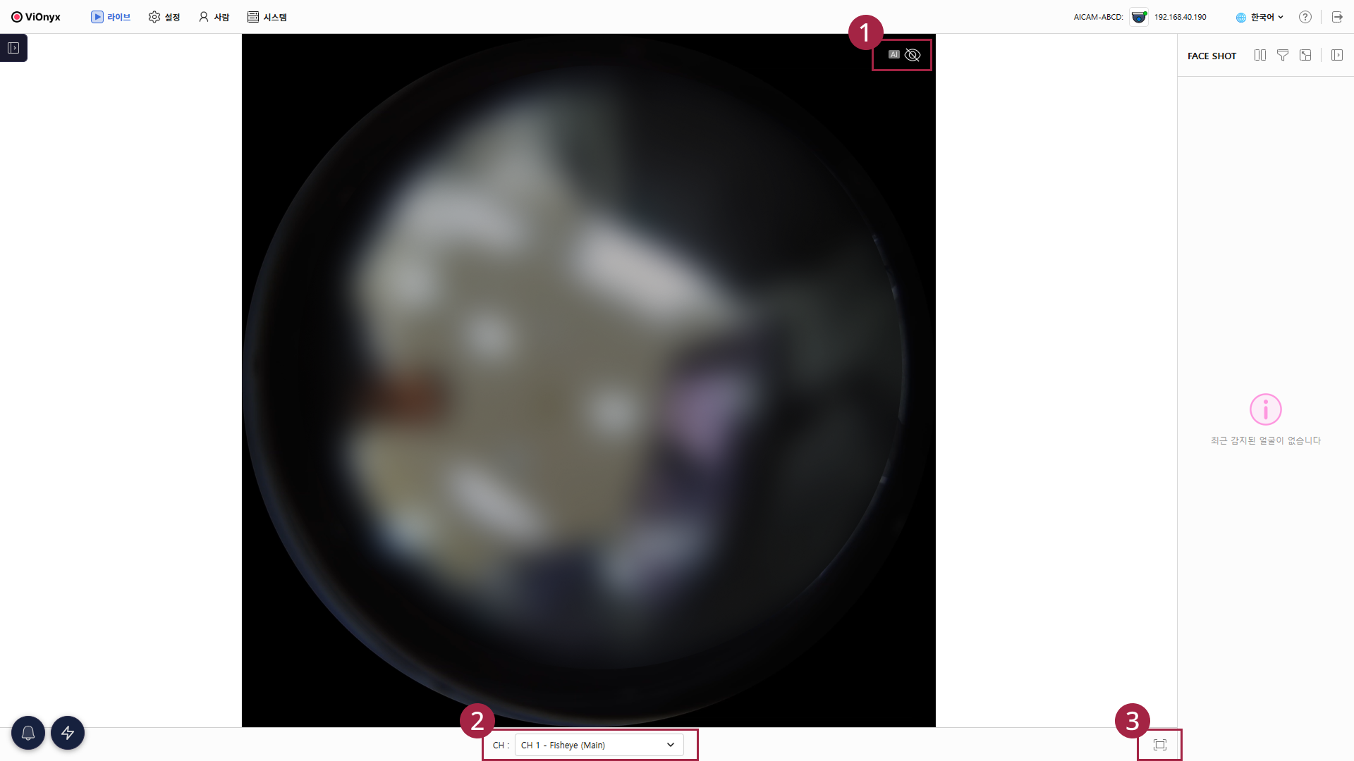 VyOnyx Web Server의 라이브 메뉴에서는 카메라가 촬영 중인 영상을 실시간으로 확인할 수 있습니다. 원하는 채널과 뷰 모드를 선택하고, 화면을 확대하거나 전체 화면으로 볼 수 있습니다.