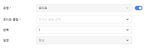 오디오 클립: 재생할 오디오 클립을 선택하세요. 오디오 클립은 시스템에 업로드된 오디오 클립 목록에서 선택할 수 있습니다.