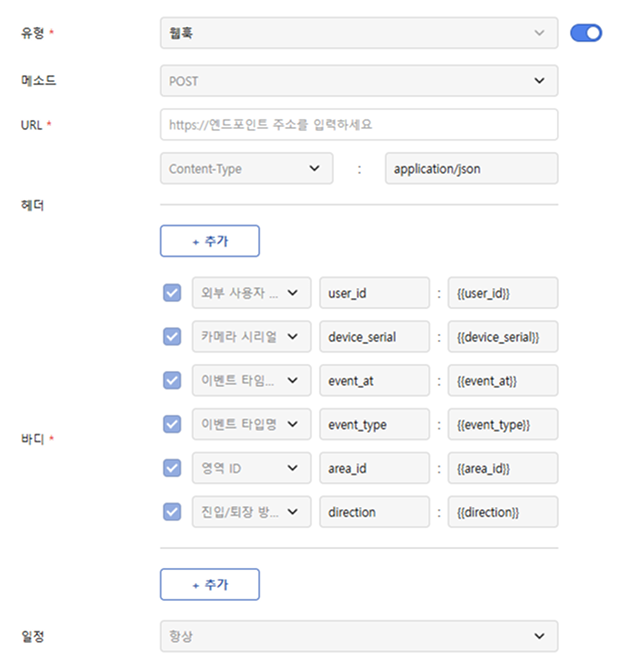 웹훅 동작은 AI 이벤트가 발생했을 때 외부 서버로 웹훅을 전송하는 기능입니다. 토글 버튼을 클릭해 웹훅 동작을 활성화하세요.