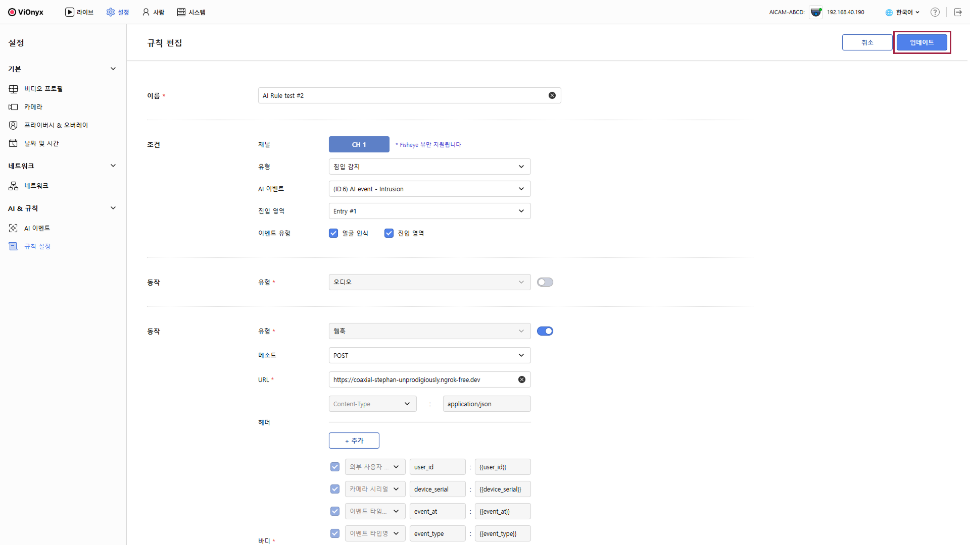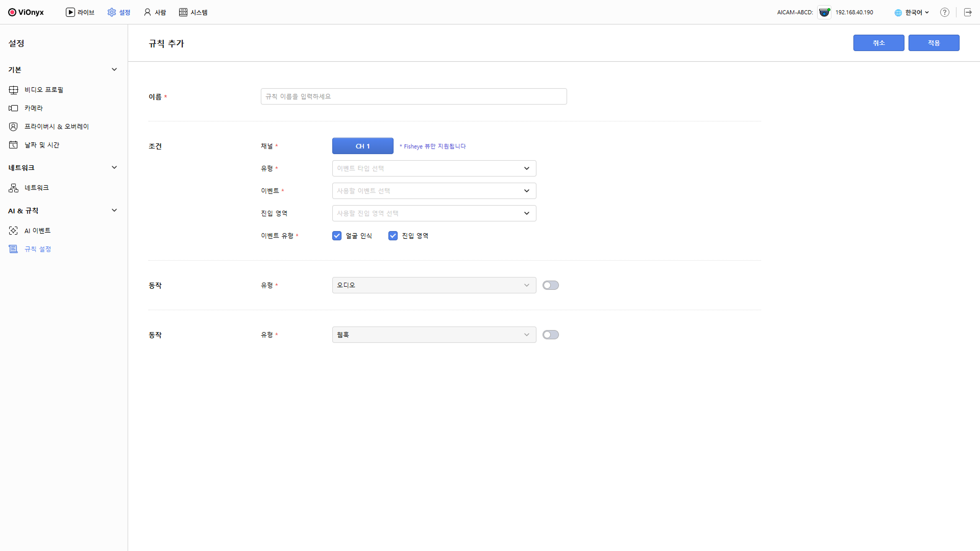 AI 규칙을 사용하면 이벤트 유형과 조건에 따라 오디오 재생 또는 웹훅 전송을 자동으로 실행할 수 있습니다. 이 문서에서는 규칙을 생성하고 운영하는 전체 절차를 안내합니다.
